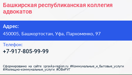 Башкирская республиканская коллегия адвокатов по адресу 450005, Башкортостан, Уфа, Пархоменко, 97 в дальнейшем Организация, размещена в следующих категориях: