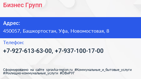 Бизнес-Групп по адресу 450057, Башкортостан, Уфа, Новомостовая, 8 в дальнейшем Организация, размещена в следующих категориях: