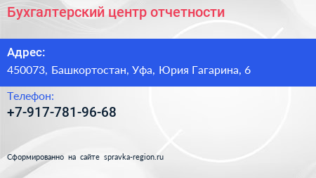Бухгалтерский центр отчетности по адресу 450073, Башкортостан, Уфа, Юрия Гагарина, 6 в дальнейшем Организация, размещена в следующих категориях: