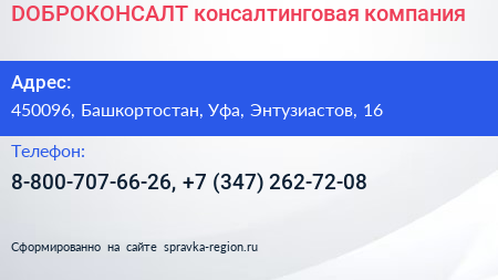 DОБРОКОНСАЛТ, консалтинговая компания по адресу 450096, Башкортостан, Уфа, Энтузиастов, 16 в дальнейшем Организация, размещена в следующих категориях: