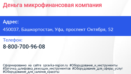 Деньга, микрофинансовая компания по адресу 450037, Башкортостан, Уфа, проспект Октября, 52 в дальнейшем Организация, размещена в следующих категориях: