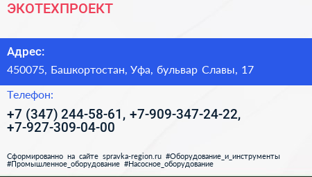 ЭКОТЕХПРОЕКТ по адресу 450075, Башкортостан, Уфа, бульвар Славы, 17 в дальнейшем Организация, размещена в следующих категориях: