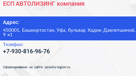 ЕСП АВТОЛИЗИНГ, компания по адресу 450001, Башкортостан, Уфа, бульвар Хадии Давлетшиной, 9 к1 в дальнейшем Организация, размещена в следующих категориях: