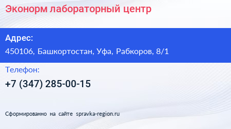 Эконорм, лабораторный центр по адресу 450106, Башкортостан, Уфа, Рабкоров, 8/1 в дальнейшем Организация, размещена в следующих категориях: