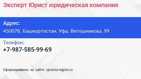 Эксперт-Юрист, юридическая компания по адресу 450078, Башкортостан, Уфа, Ветошникова, 99 в дальнейшем Организация, размещена в следующих категориях: