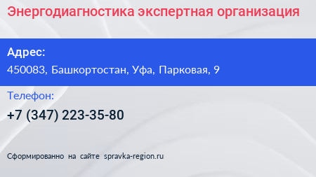 Энергодиагностика, экспертная организация по адресу 450083, Башкортостан, Уфа, Парковая, 9 в дальнейшем Организация, размещена в следующих категориях: