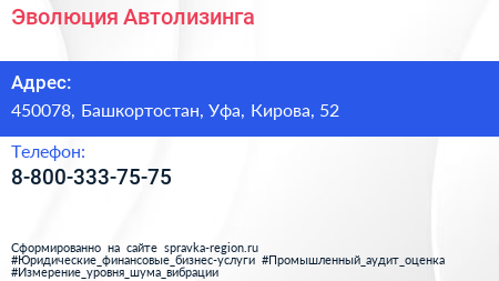Эволюция Автолизинга по адресу 450078, Башкортостан, Уфа, Кирова, 52 в дальнейшем Организация, размещена в следующих категориях: