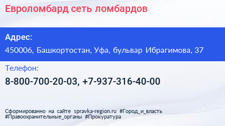 Евроломбард, сеть ломбардов по адресу 450006, Башкортостан, Уфа, бульвар Ибрагимова, 37 в дальнейшем Организация, размещена в следующих категориях: