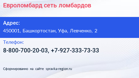 Евроломбард, сеть ломбардов по адресу 450001, Башкортостан, Уфа, Левченко, 2 в дальнейшем Организация, размещена в следующих категориях: