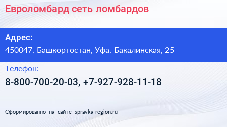 Евроломбард, сеть ломбардов по адресу 450047, Башкортостан, Уфа, Бакалинская, 25 в дальнейшем Организация, размещена в следующих категориях: