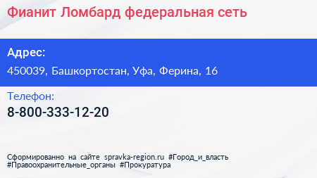 Фианит-Ломбард, федеральная сеть по адресу 450039, Башкортостан, Уфа, Ферина, 16 в дальнейшем Организация, размещена в следующих категориях: