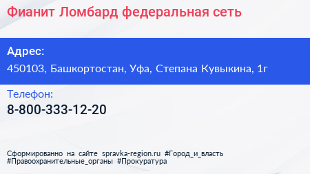 Фианит-Ломбард, федеральная сеть по адресу 450103, Башкортостан, Уфа, Степана Кувыкина, 1г в дальнейшем Организация, размещена в следующих категориях: