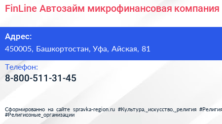 FinLine-Автозайм, микрофинансовая компания по адресу 450005, Башкортостан, Уфа, Айская, 81 в дальнейшем Организация, размещена в следующих категориях:
