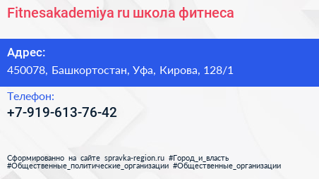 Fitnesakademiya.ru, школа фитнеса по адресу 450078, Башкортостан, Уфа, Кирова, 128/1 в дальнейшем Организация, размещена в следующих категориях: