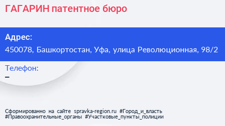 ГАГАРИН, патентное бюро по адресу 450078, Башкортостан, Уфа, улица Революционная, 98/2 в дальнейшем Организация, размещена в следующих категориях:
