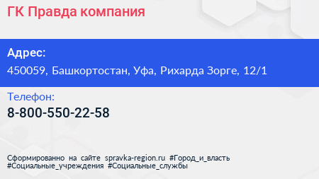ГК Правда, компания по адресу 450059, Башкортостан, Уфа, Рихарда Зорге, 12/1 в дальнейшем Организация, размещена в следующих категориях: