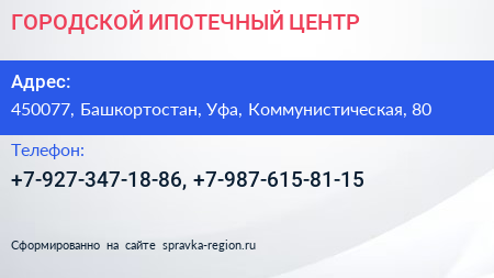 ГОРОДСКОЙ ИПОТЕЧНЫЙ ЦЕНТР по адресу 450077, Башкортостан, Уфа, Коммунистическая, 80 в дальнейшем Организация, размещена в следующих категориях: