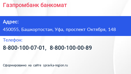 Газпромбанк, банкомат по адресу 450055, Башкортостан, Уфа, проспект Октября, 148 в дальнейшем Организация, размещена в следующих категориях: