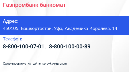 Газпромбанк, банкомат по адресу 450105, Башкортостан, Уфа, Академика Королёва, 14 в дальнейшем Организация, размещена в следующих категориях: