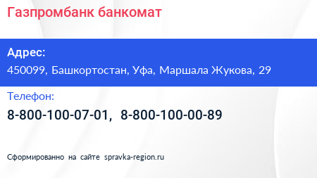 Газпромбанк, банкомат по адресу 450099, Башкортостан, Уфа, Маршала Жукова, 29 в дальнейшем Организация, размещена в следующих категориях: