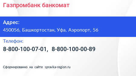 Газпромбанк, банкомат по адресу 450056, Башкортостан, Уфа, Аэропорт, 56 в дальнейшем Организация, размещена в следующих категориях: