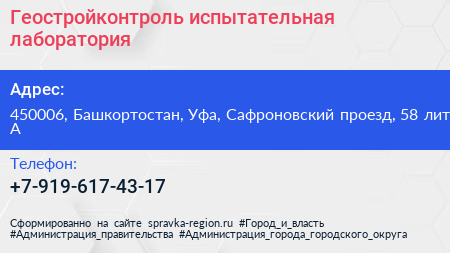 Геостройконтроль, испытательная лаборатория по адресу 450006, Башкортостан, Уфа, Сафроновский проезд, 58 лит А в дальнейшем Организация, размещена в следующих категориях:
