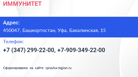 ИММУНИТЕТ по адресу 450047, Башкортостан, Уфа, Бакалинская, 15 в дальнейшем Организация, размещена в следующих категориях: