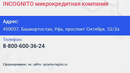 INCOGNITO, микрокредитная компания по адресу 450037, Башкортостан, Уфа, проспект Октября, 52/2а в дальнейшем Организация, размещена в следующих категориях: