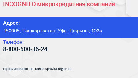 INCOGNITO, микрокредитная компания по адресу 450005, Башкортостан, Уфа, Цюрупы, 102а в дальнейшем Организация, размещена в следующих категориях: