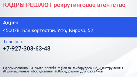 КАДРЫ РЕШАЮТ, рекрутинговое агентство по адресу 450078, Башкортостан, Уфа, Кирова, 52 в дальнейшем Организация, размещена в следующих категориях: