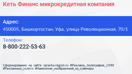 Кеть Финанс, микрокредитная компания по адресу 450005, Башкортостан, Уфа, улица Революционная, 70/1 в дальнейшем Организация, размещена в следующих категориях: