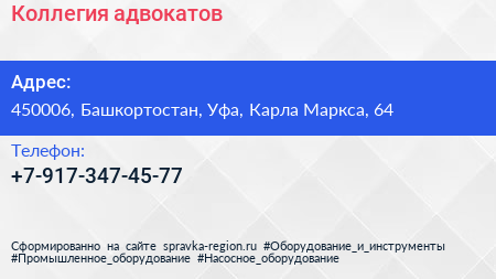 Коллегия адвокатов по адресу 450006, Башкортостан, Уфа, Карла Маркса, 64 в дальнейшем Организация, размещена в следующих категориях: