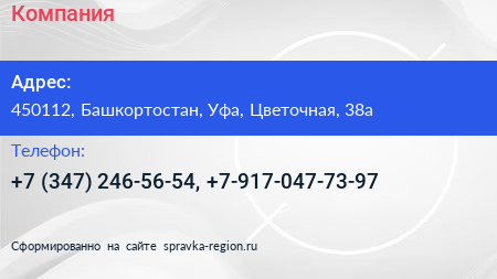 Для связи с организацией воспользуйтесь номером телефона: +7 (347) 246-56-54, +7-917-047-73-97. Пн: c 09:00-18:00, Вт: c 09:00-18:00, Ср: c 09:00-18:00, Чт: c 09:00-18:00, Пт: c 09:00-18:00, Сб: выходной, Вс: выходной, вы можете обратиться в эту организацию.