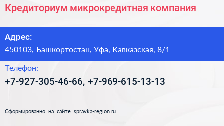 Кредиториум, микрокредитная компания по адресу 450103, Башкортостан, Уфа, Кавказская, 8/1 в дальнейшем Организация, размещена в следующих категориях: