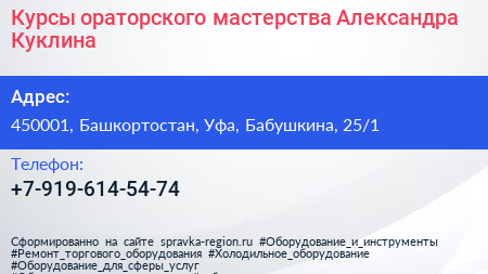 Курсы ораторского мастерства Александра Куклина по адресу 450001, Башкортостан, Уфа, Бабушкина, 25/1 в дальнейшем Организация, размещена в следующих категориях: