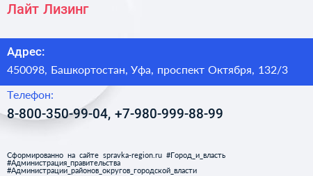 Лайт Лизинг по адресу 450098, Башкортостан, Уфа, проспект Октября, 132/3 в дальнейшем Организация, размещена в следующих категориях: