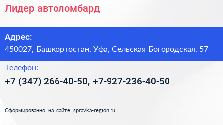 Лидер, автоломбард по адресу 450027, Башкортостан, Уфа, Сельская Богородская, 57 в дальнейшем Организация, размещена в следующих категориях: