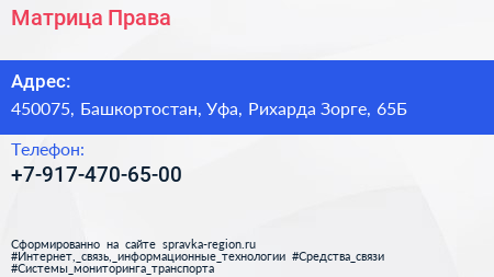 Матрица Права по адресу 450075, Башкортостан, Уфа, Рихарда Зорге, 65Б в дальнейшем Организация, размещена в следующих категориях: