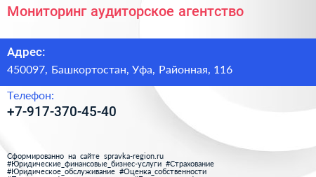 Мониторинг, аудиторское агентство по адресу 450097, Башкортостан, Уфа, Районная, 116 в дальнейшем Организация, размещена в следующих категориях: