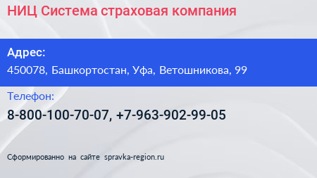НИЦ Система, страховая компания по адресу 450078, Башкортостан, Уфа, Ветошникова, 99 в дальнейшем Организация, размещена в следующих категориях: