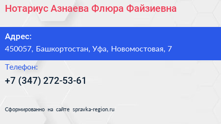 Нотариус Азнаева Флюра Файзиевна по адресу 450057, Башкортостан, Уфа, Новомостовая, 7 в дальнейшем Организация, размещена в следующих категориях: