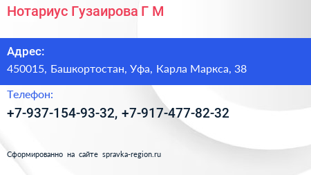 Нотариус Гузаирова Г.М. по адресу 450015, Башкортостан, Уфа, Карла Маркса, 38 в дальнейшем Организация, размещена в следующих категориях: