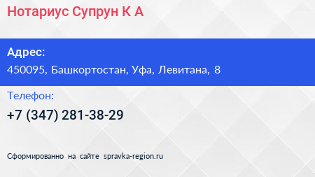 Нотариус Супрун К.А. по адресу 450095, Башкортостан, Уфа, Левитана, 8 в дальнейшем Организация, размещена в следующих категориях:
