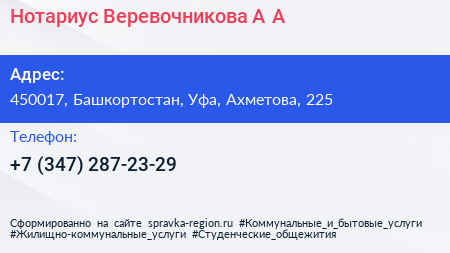 Нотариус Веревочникова А.А. по адресу 450017, Башкортостан, Уфа, Ахметова, 225 в дальнейшем Организация, размещена в следующих категориях: