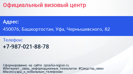 Официальный визовый центр по адресу 450076, Башкортостан, Уфа, Чернышевского, 82 в дальнейшем Организация, размещена в следующих категориях: