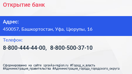 Открытие, банк по адресу 450057, Башкортостан, Уфа, Цюрупы, 16 в дальнейшем Организация, размещена в следующих категориях:
