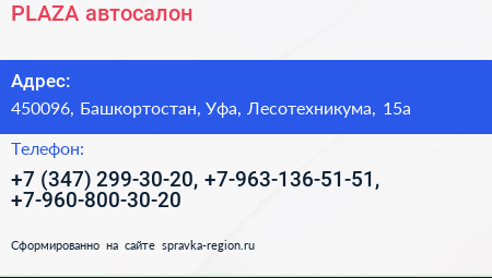 PLAZA, автосалон по адресу 450096, Башкортостан, Уфа, Лесотехникума, 15а в дальнейшем Организация, размещена в следующих категориях: