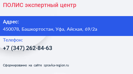 ПОЛИС, экспертный центр по адресу 450078, Башкортостан, Уфа, Айская, 69/2а в дальнейшем Организация, размещена в следующих категориях: