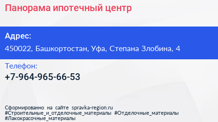 Панорама, ипотечный центр по адресу 450022, Башкортостан, Уфа, Степана Злобина, 4 в дальнейшем Организация, размещена в следующих категориях: