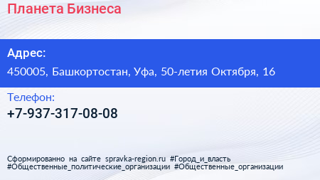 Планета Бизнеса по адресу 450005, Башкортостан, Уфа, 50-летия Октября, 16 в дальнейшем Организация, размещена в следующих категориях: